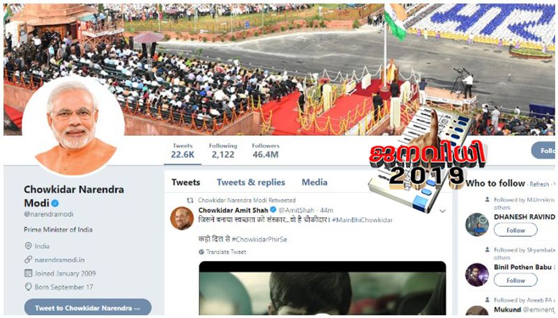 ദില്ലി: ട്വിറ്ററിൽ 'ചൗകീദാർ നരേന്ദ്രമോദി' എന്ന് പേര് മാറ്റി പ്രധാനമന്ത്രി. പിന്തുണയുമായി ബിജെപി അധ്യക്ഷൻ അമിത് ഷായും, പിയൂഷ് ഗോയലടക്കമുള്ള കേന്ദ്രമന്ത്രിമാരും പേര് മാറ്റിയിട്ടുണ്ട്. രാഹുൽ ഗാന്ധിയുടെ 'ചൗകീദാർ ചോർ ഹേ' മുദ്രാവാക്യത്തിന് മറുപടിയുമായി ബിജെപി 'ഹം ഭീ ചൗകീദാർ' ഹാഷ്ടാഗ് പ്രചാരണം തുടങ്ങിയതിന് പിറ്റേന്നാണ് മോദിയുടെ പേര് മാറ്റം.
